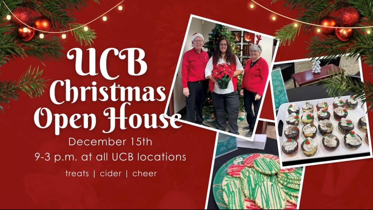 Join UCB as we open the doors to the community to celebrate the Christmas season. We'll have cookies, cupcakes, cider, and plenty of holiday cheer. We can't wait to see you, and thank you for making us your community bank!Images