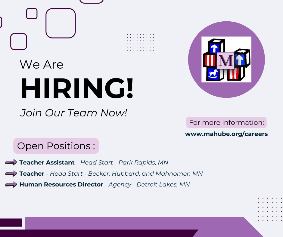 MAHUBE-OTWA is actively recruiting a Head Start/Early Head Start TEACHER FLOAT to work on our Hubbard, Becker, and Mahnomen counties as needed. Seeking caring individuals with a strong independent initiative, and experience implementing developmentally appropriate practices in early childhood development to work in our Head Start Center. Your workdays will be filled with educating young minds, laughter, art, stories, hugs and so much more. Go home each day having had fun at work and feeling like you made a difference!