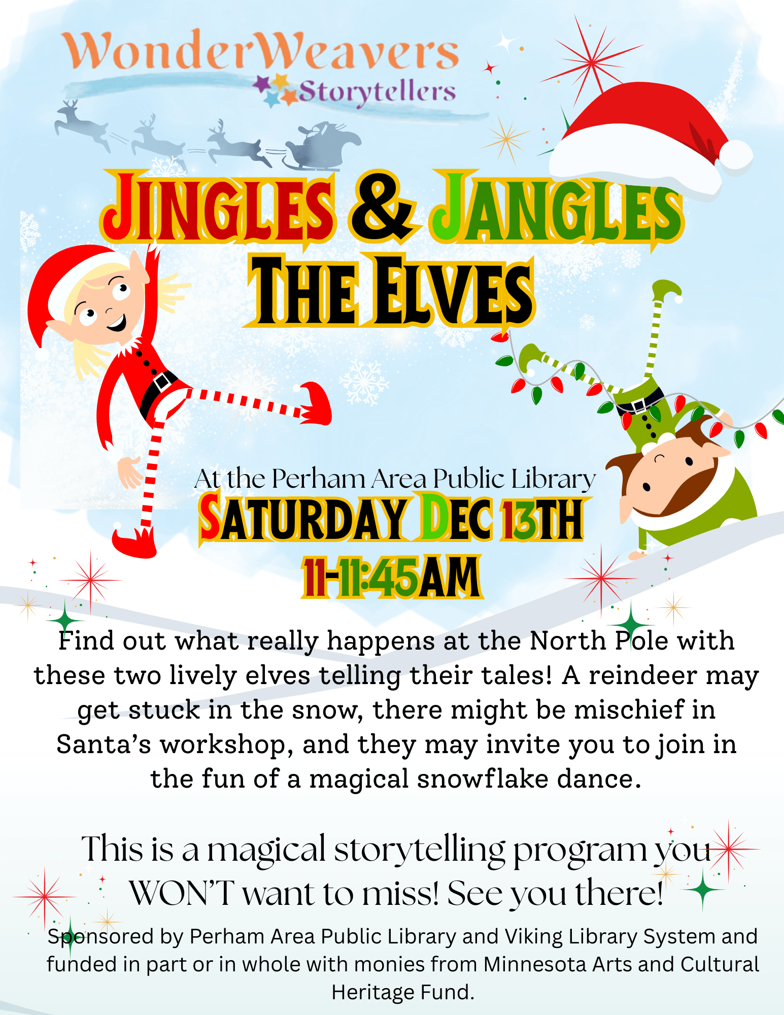 Find out what REALLY happens at the North Pole when these two lively elves tell their tales. A reindeer may get stuck in the now or their might be mischief in Santa's workshop! This is a magical storytelling program you won't want to miss. Free for all children and their families! Sponsored by Perham Area Public Library and Viking Library System and funded in part or in whole with monies from Minnesota Arts and Cultural Heritage fund.