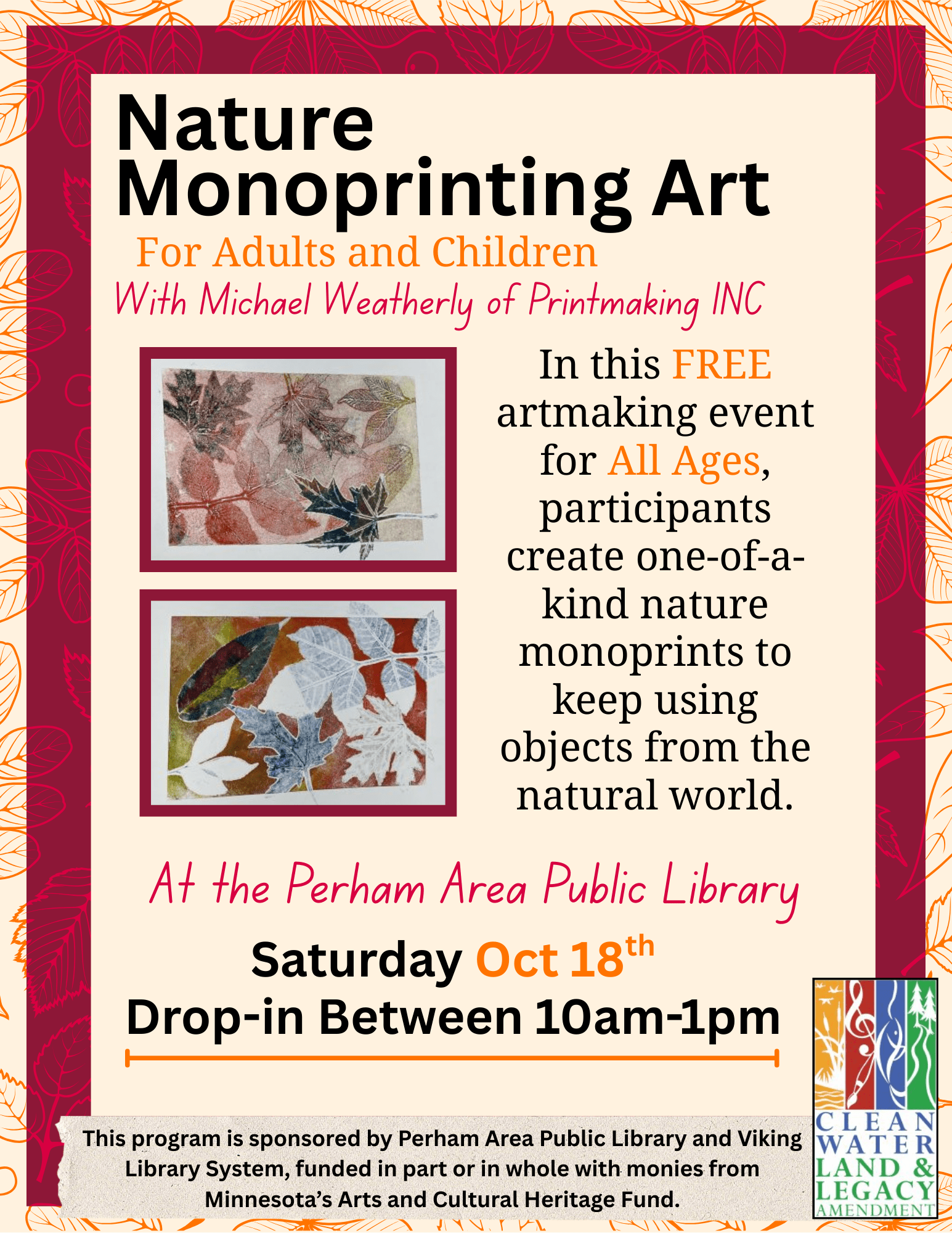 FREE art printing event with artist Michael Weatherly of Printmaking INC, participants create one-of-a-kind nature monoprints using objects from the natural world. All supplied provided. Drop in any time between 10am and 1pm. This program is sponsored by Perham Area Public Library and Viking Library System, funded in part or in whole with monies from Minnesota's Arts and Cultural Heritage fund.