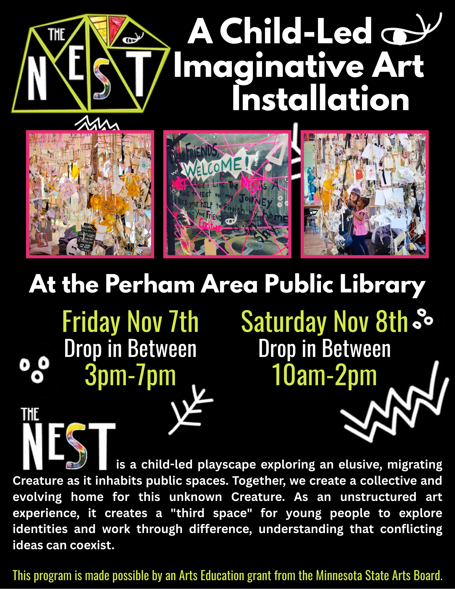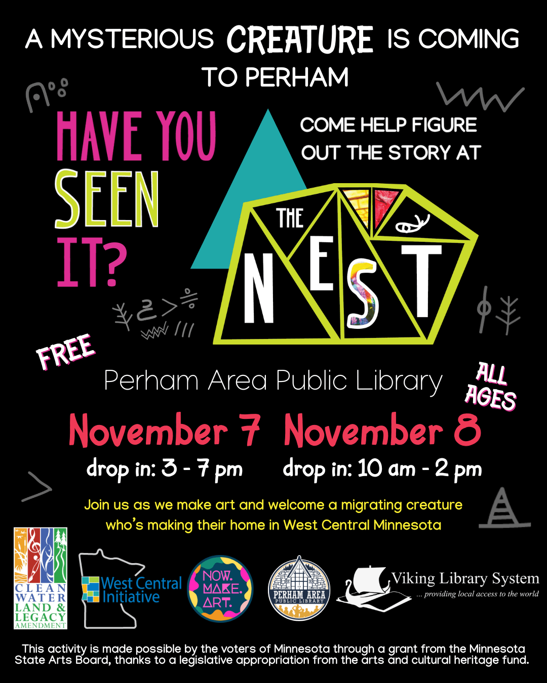 Join us as we make art and welcome a migrating creature who's making their home in West Central Minnesota! Have you seen it??? Help us to figure out the story at the Perham Area Public Library! Drop in to participate anytime between 3-7pm on Friday November 7 and 10am-2pm on Saturday November 8. This activity is made possible by the voters of Minnesota through a grant from the Minnesota State Arts Board, thanks to a legislative appropriation from the arts and cultural heritage fund.